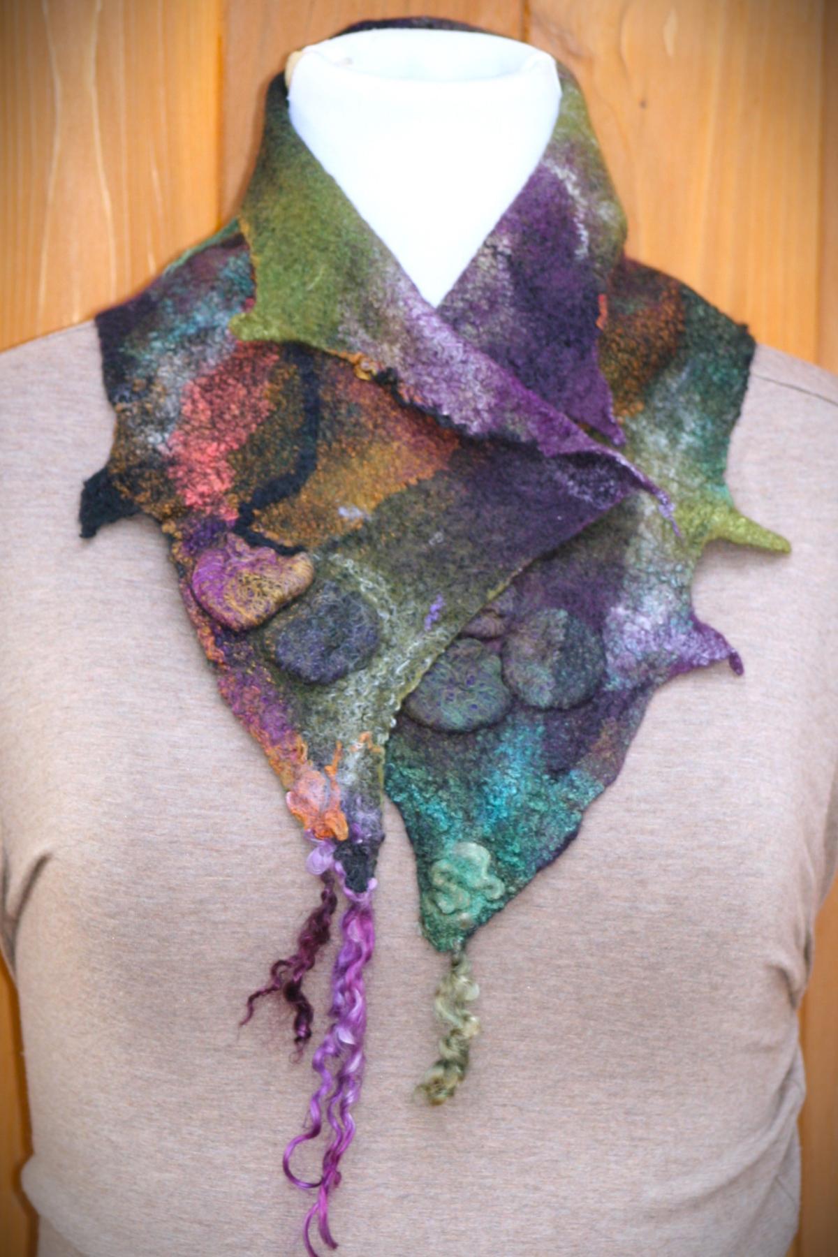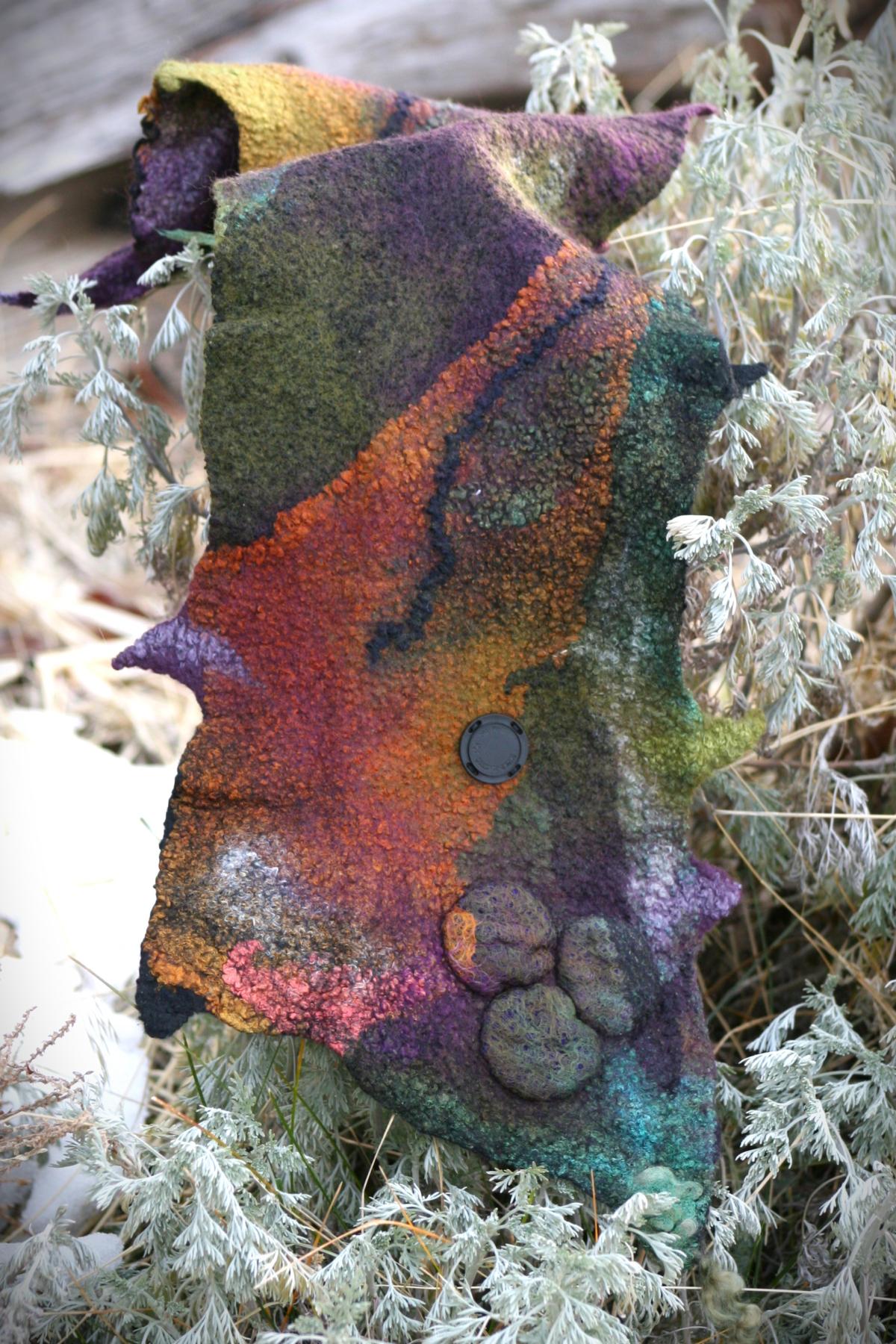 Desert Sunset mini scarf with magnetic button fastener sewn in place. Nuno felted with super-fine merino wool and painted with different shades of margilan silk. One-of-a-kind.