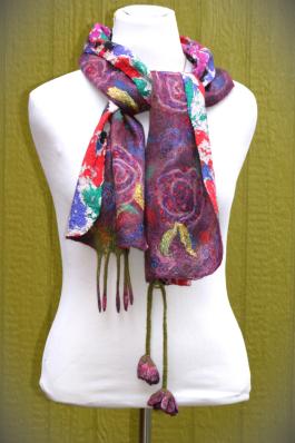 Colorful, double-sided Purple Art scarf with floral tassels. Unique nuno- felted scarf using super-fine merino wool hand felted with upcycled fabrics and ribbons to create a floral motif. The back side is upcycled fabric. Floral tassels on ends. Light weight but still cozy. It will add a pop of color to any outfit.
